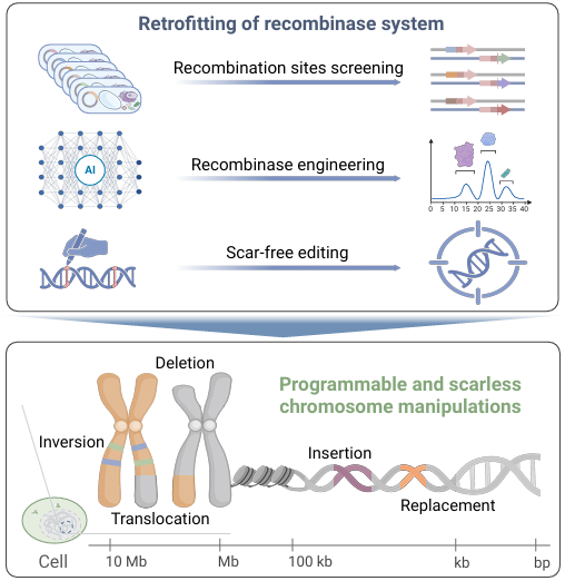 位点特异性重组酶Cre-Lox系统具有染色体水平DNA操纵潜力,但其进一步应用受到三大关键问题制约。为此,研究团队构建系统性技术路径,实现三项关键技术创新,为超大片段DNA精准无痕编辑装上“导航系统”。