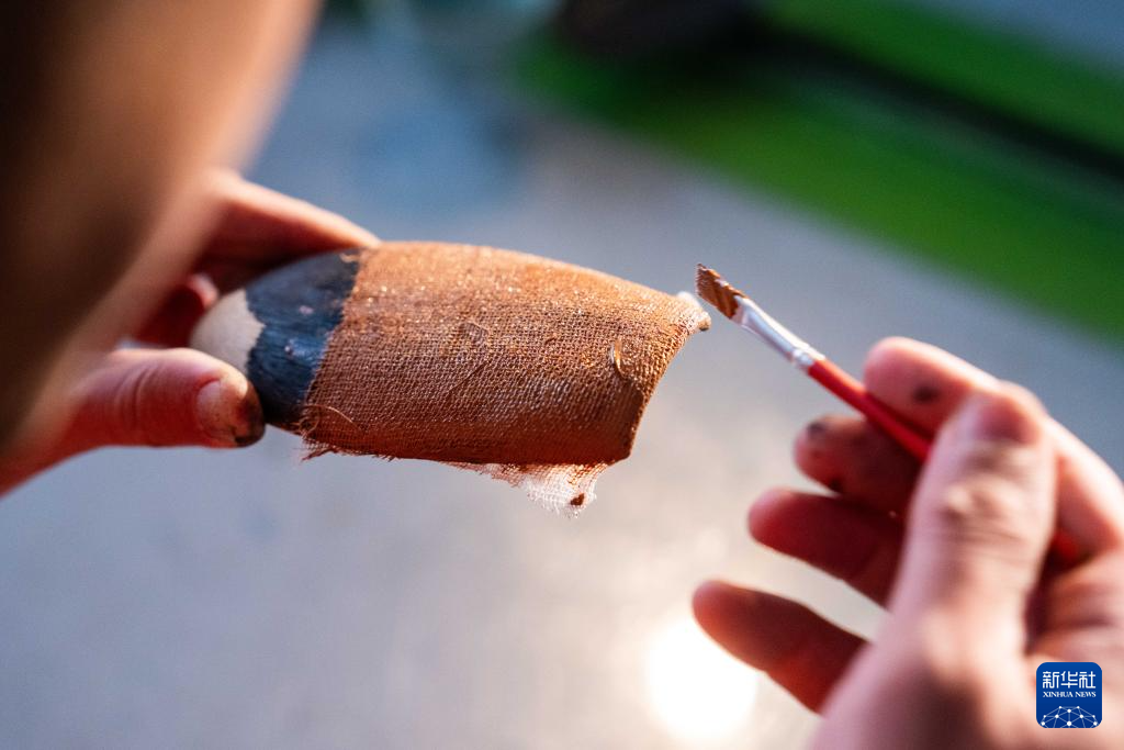 2月28日,郝冠雄给大漆瓜子吊坠包金箔。