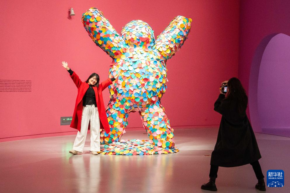 2月18日,观众在梅溪湖艺术博物馆与展品合影。