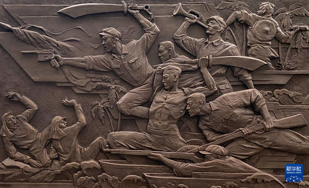 这是解放军文工团雕塑创作员郎钺创作的,以东江纵队抗战为背景的浮雕《南粤烽火 卫士先驱》。