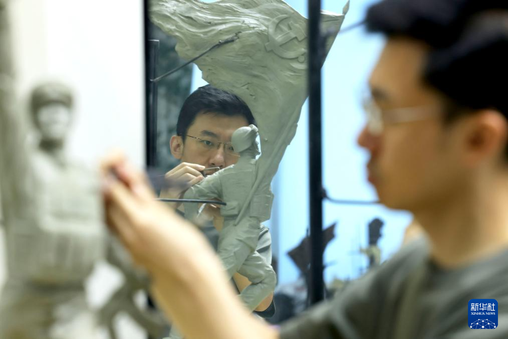 7月17日,解放军文工团雕塑创作员郎钺在擦拭雕塑。