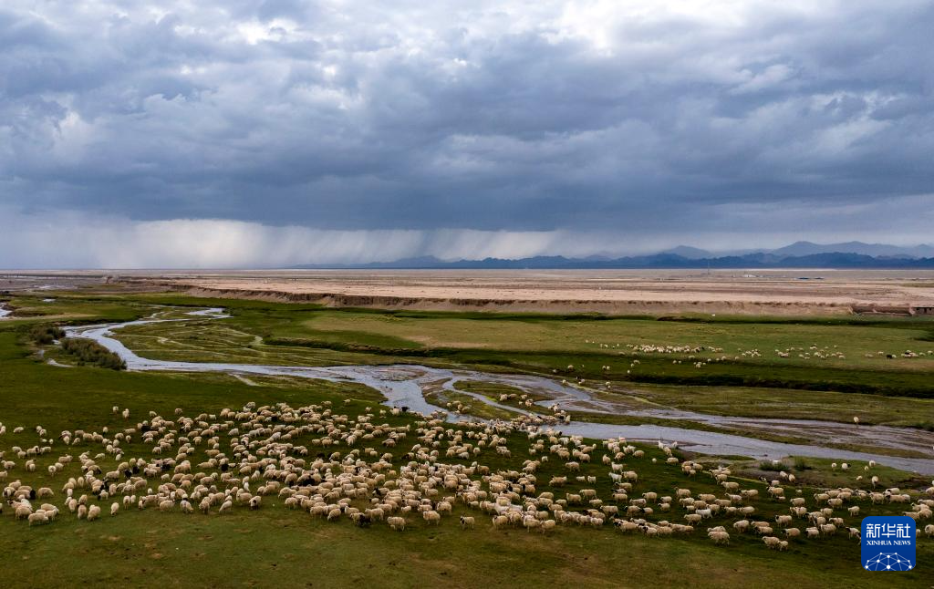 7月12日,在甘肃省阿克塞哈萨克族自治县阿勒腾乡哈尔腾村,羊群在夏日牧场吃草,远处正在降雨(无人机照片)。