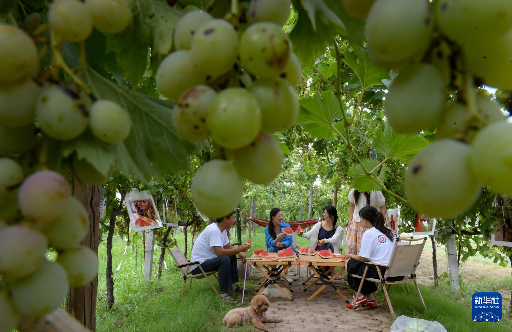 8月2日,在河南省商丘市夏邑县太平镇,人们在葡萄架下吃瓜休闲,避暑消夏。