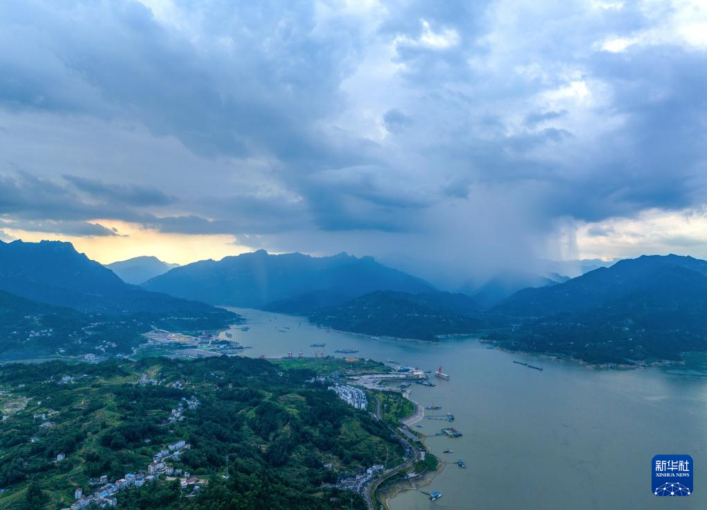 7月28日傍晚,长江三峡湖北省宜昌市秭归县水域附近呈现“东晴西雨”景观(无人机照片)。