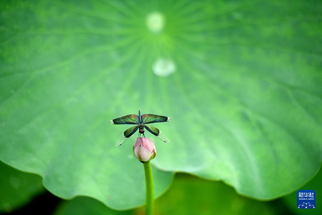 7月1日,在河北沧州狮城公园,一只蜻蜓停留在荷花花苞上。