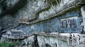 8月9日,游客在广西河池市罗城仫佬族自治县棉花天坑景区内的悬崖书店游玩。