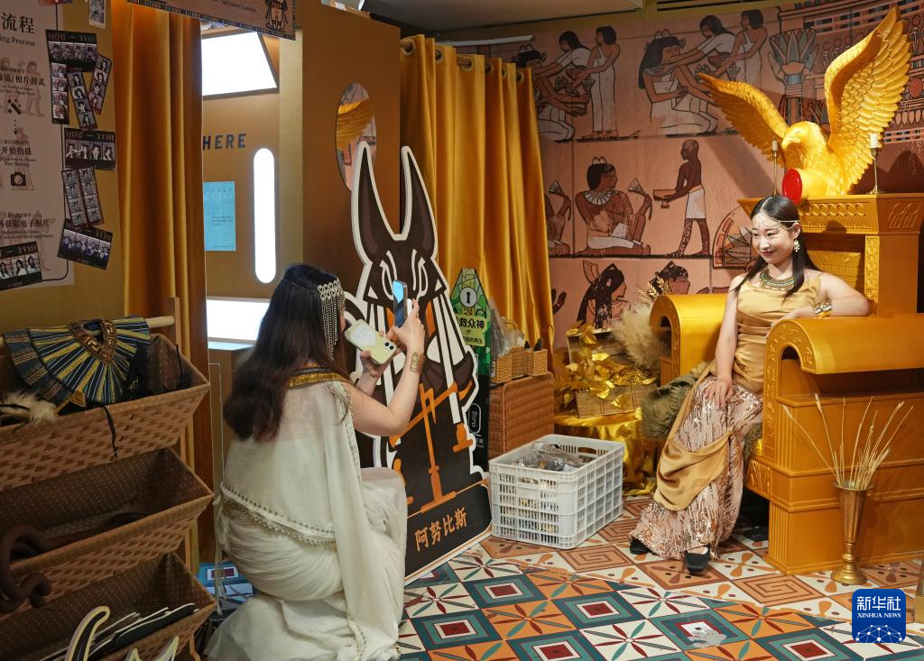 8月11日晚,观众在上海博物馆文创商店拍摄埃及风格形象照。