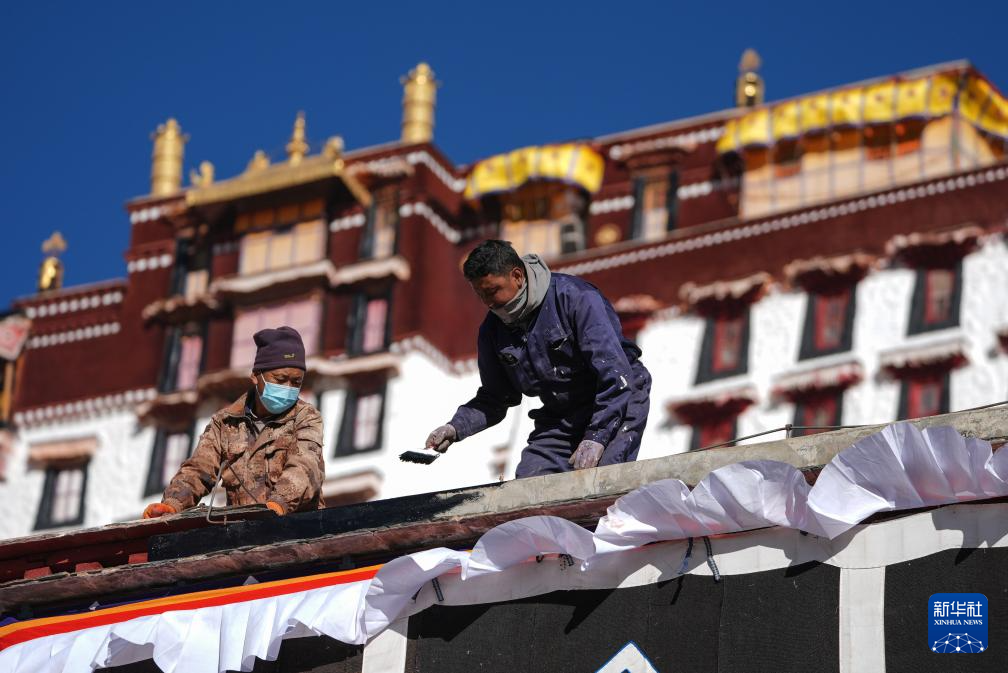 布达拉宫管理处维修科工作人员在粉刷墙体(2024年12月4日摄)。新华社记者 晋美多吉 摄