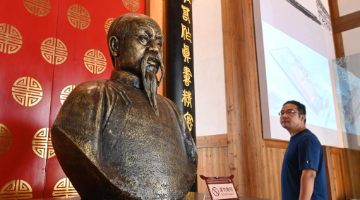 8月26日,观众在建德市航头镇航川村文化礼堂内参观作品。