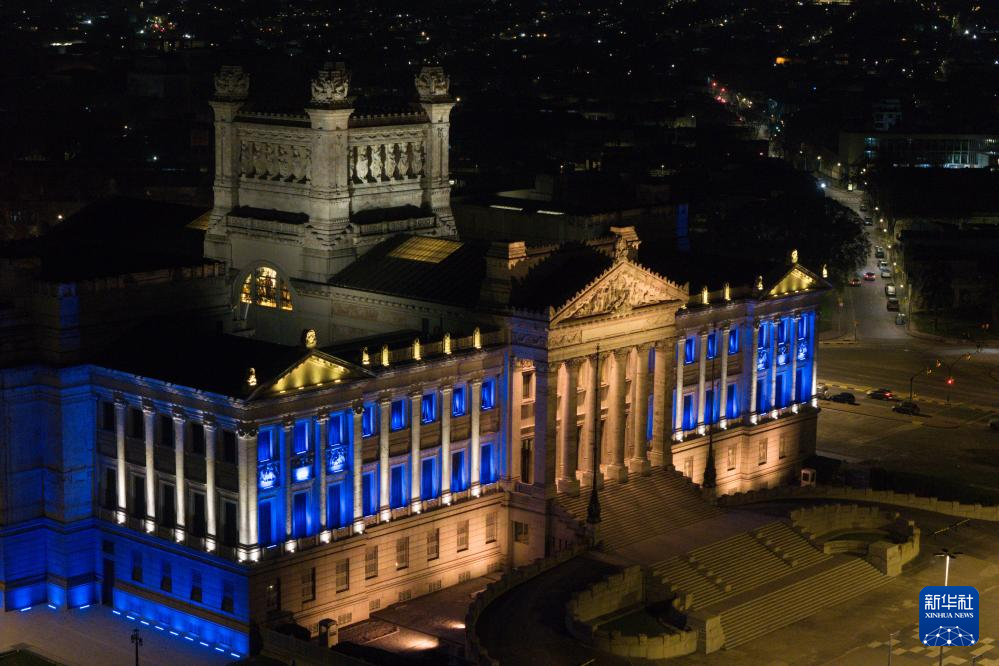 8月25日,乌拉圭在位于首都蒙得维的亚的立法宫举行音乐会,纪念宣告独立200周年。音乐会后,立法宫亮起彩灯(无人机照片)。