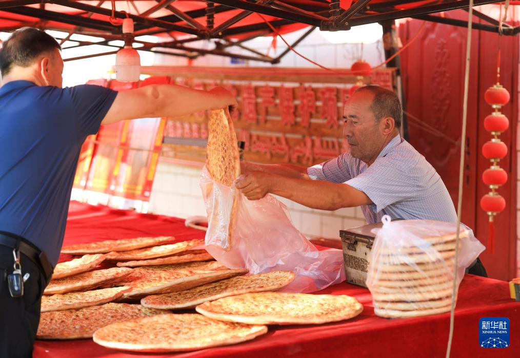 7月22日,在新疆库车市,居民从热西提馕店买馕后离开。