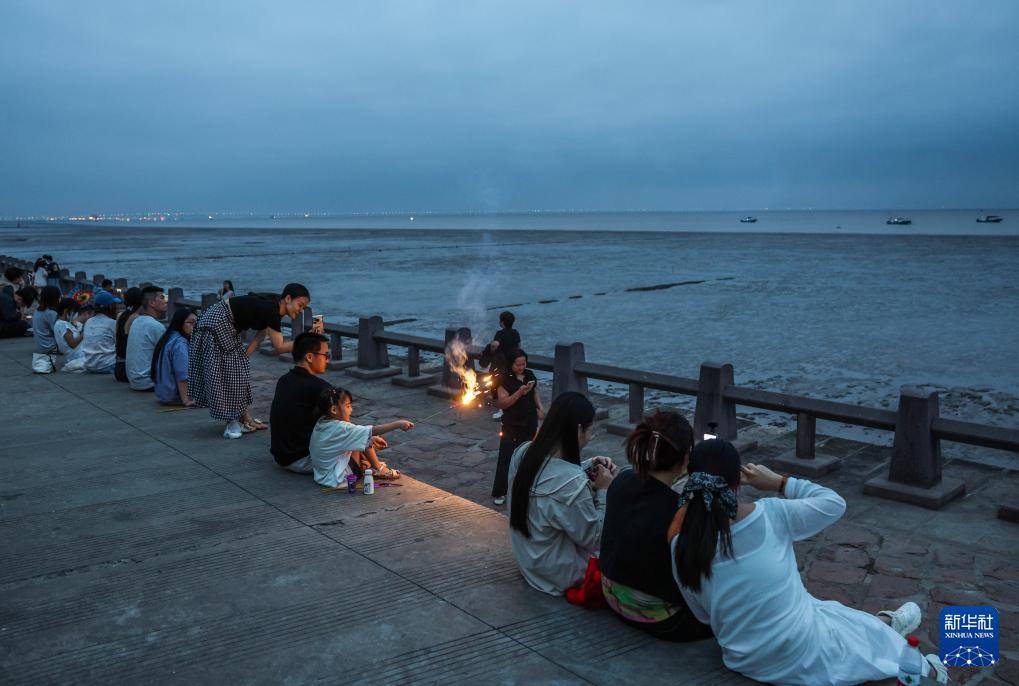 9月20日清晨,人们在海盐的观海园海塘边等待观看日出。