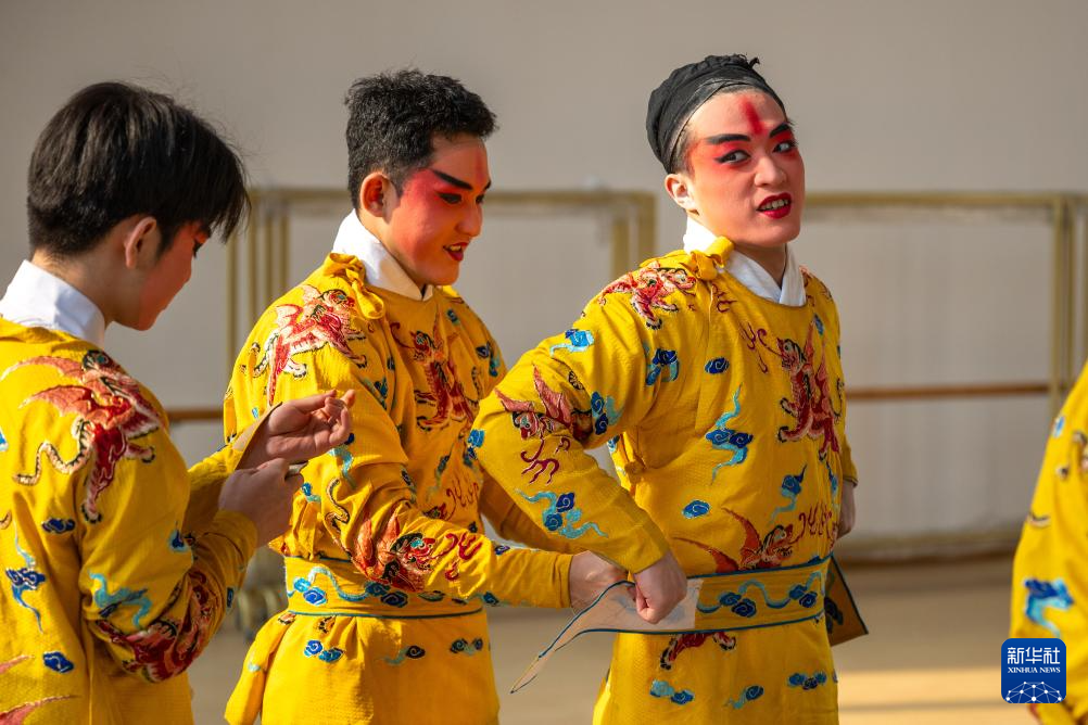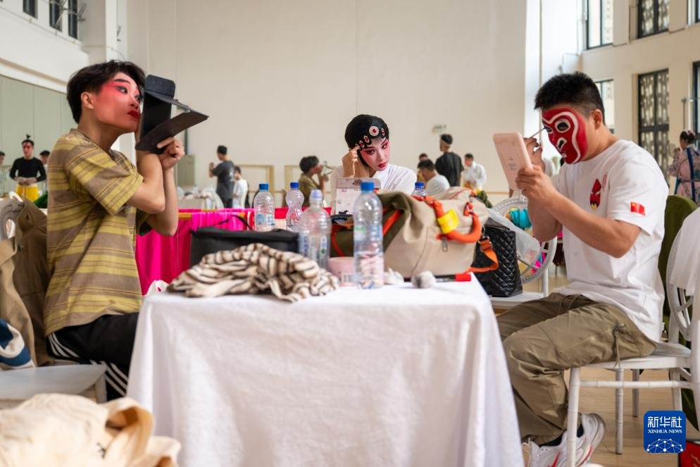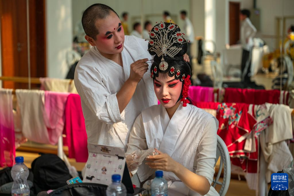 9月25日,在刚果(金)首都金沙萨,来自中国的婺剧演员在后台化妆备演。