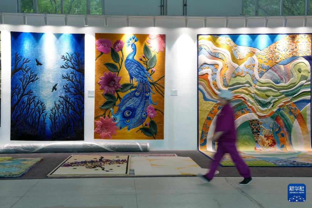 9月27日,在西宁市圣源地毯集团有限公司生产车间,一名操作工从展示的藏毯前走过。