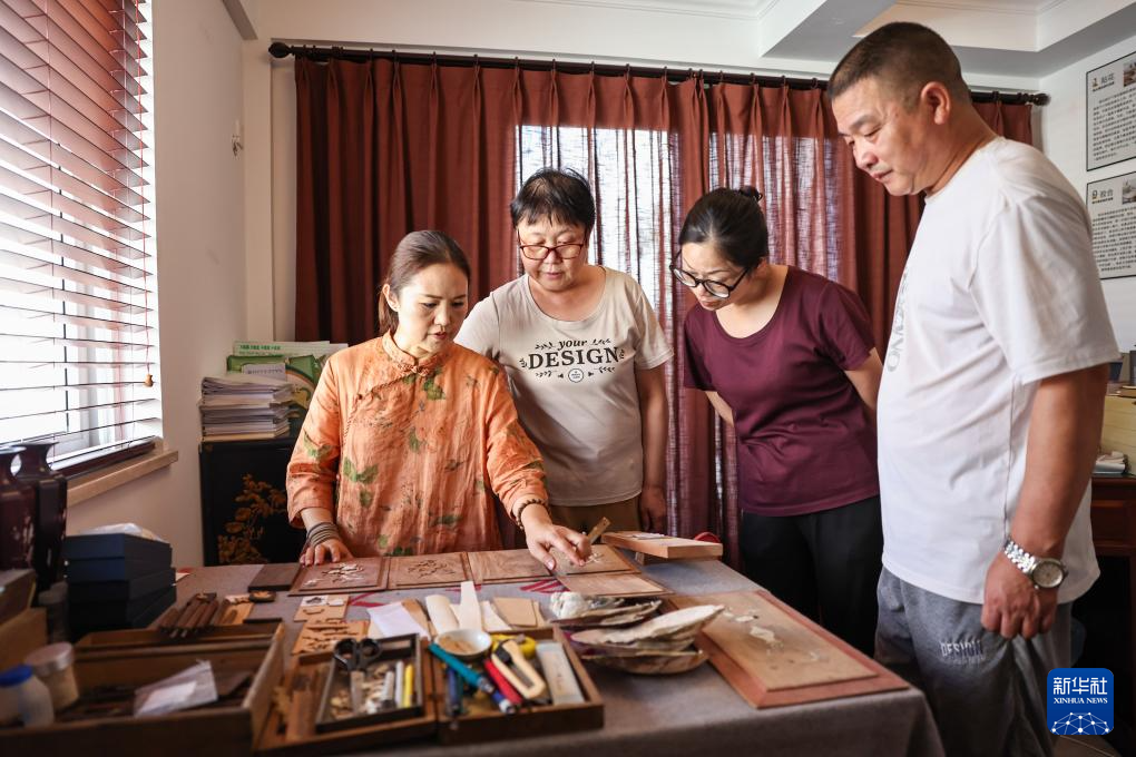 10月15日,胡蓉(左一)在孔浦街道怡江社区的非遗工作室为居民介绍骨木镶嵌艺术品的制作方法。