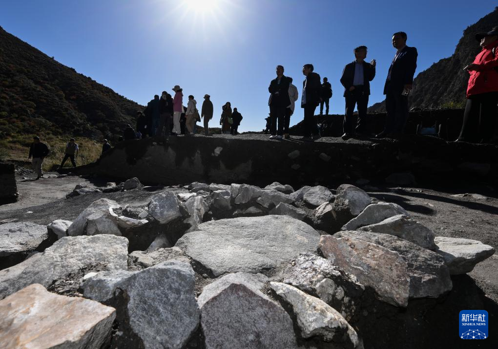 考古学家们在对苏峪口瓷窑址2025年度发掘区出土的一处石英加工遗迹进行考察(10月13日摄)。