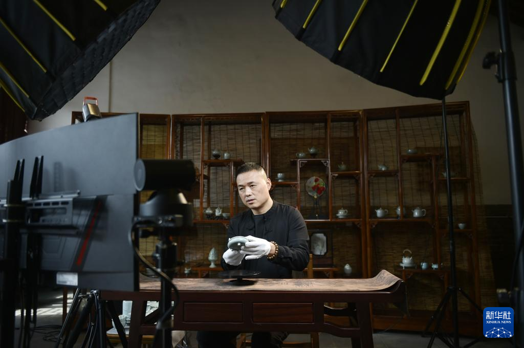 10月22日,河南省汝州市“宋京御窑厂”的汝瓷艺人赵永恒准备通过线上直播推广汝瓷作品。
