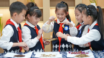 10月25日,在瑞士首都伯尔尼,小朋友在“遇见中国”文化节上体验制作香囊。