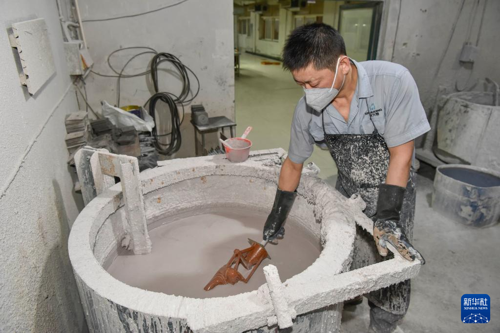10月29日,安徽铜陵一家铜器制作企业的铜艺工人在灌蜡制作蜡模。