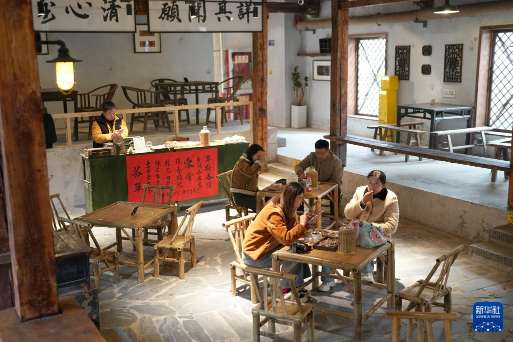 12月6日,游人在西安西仓市集文创公园一家茶馆内喝茶。这座公园由位于西安市莲湖区的老西仓市集改造而来。