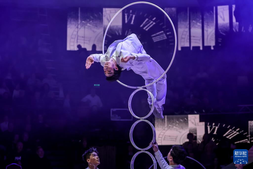 1月12日,在匈牙利首都布达佩斯,中国杂技团演员在表演《时光》。