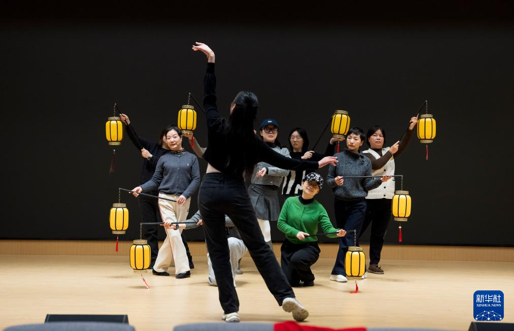 1月19日,在苏州市工人文化宫的多功能厅,企业职工在舞蹈老师带领下排练年会舞蹈。