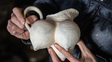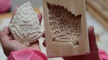1月22日,当地百姓在周巷镇万安庄村文化礼堂“我们的村晚”活动现场体验制作绿豆糕。