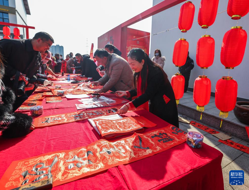 1月22日,在周巷镇万安庄村文化礼堂“我们的村晚”民俗年俗展示活动现场,书法爱好者在给百姓书写福字和春联。