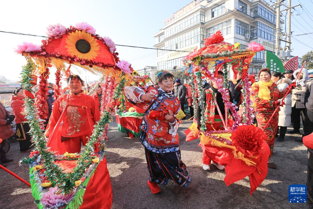 2月2日,在江苏省连云港市赣榆区墩尚镇,人们进行民俗“踩街”表演。