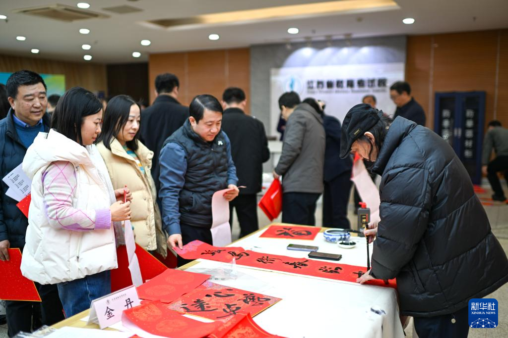 2月3日,南京艺术学院的书法教师为江苏省教育考试院干部职工书写春联。
