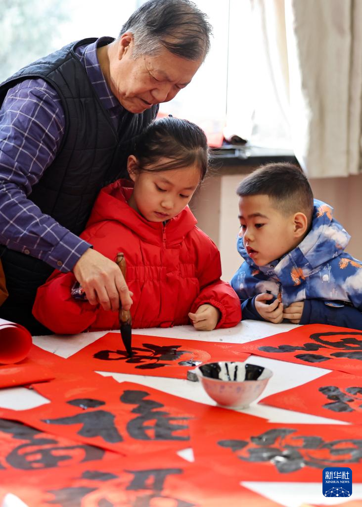 2月4日,在甘肃兰州市城关区,书法爱好者教张掖路街道山字石社区“寒假公益托管班”的孩子写福字。