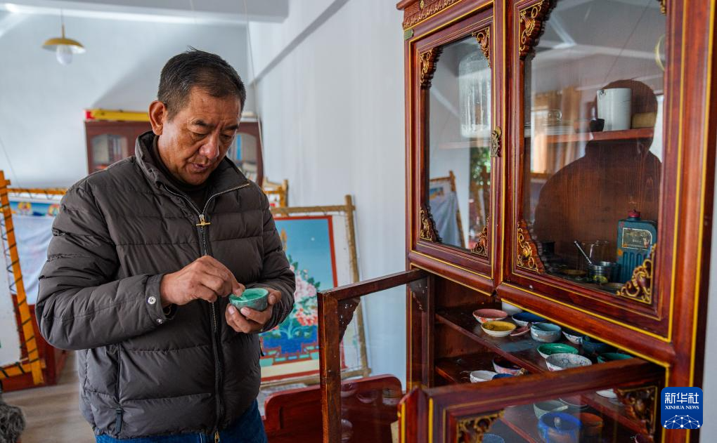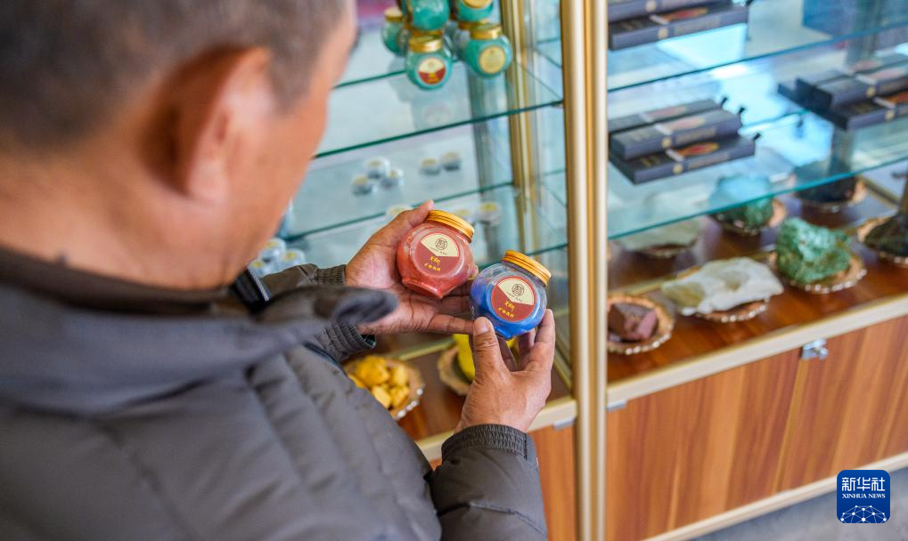 2月10日,罗布斯达在西藏唐卡画院的展厅里查看用矿物制作的颜料。