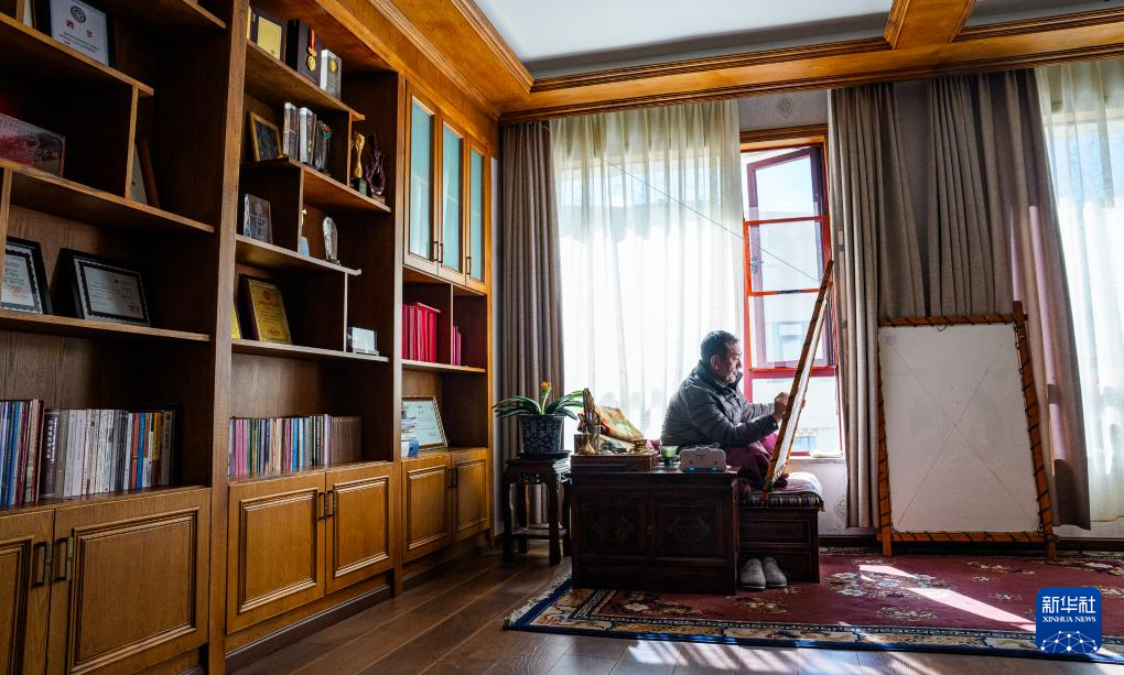 2月10日,罗布斯达在西藏唐卡画院的办公室里画唐卡。