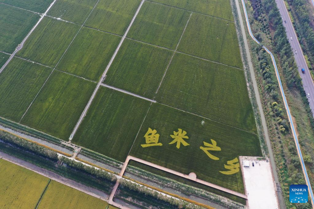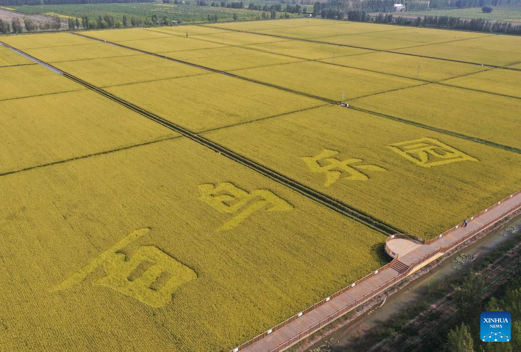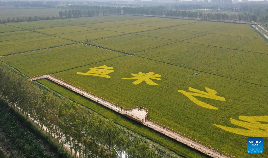 Aerial photo taken on Sept. 24, 2022 shows paddy fields at a rice planting demonstration zone in Dawang Town of Anxin County of Xiong'an New Area, north China's Hebei Province. Anxin County of Xiong'an New Area has a long history of rice cultivation. Located near Baiyangdian Lake, the largest wetland ecosystem in northern China, Anxin County has exceptional irrigation advantage in rice planting. In recent years, Anxin County has adopted rice-fish and rice-crab co-culture modes to build a modern eco-agriculture demonstration zone. (Xinhua/Zhu Xudong)