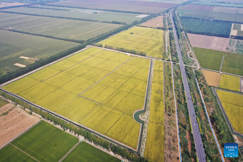 Aerial photo taken on Sept. 24, 2022 shows paddy fields at a rice planting demonstration zone in Dawang Town of Anxin County of Xiong'an New Area, north China's Hebei Province. Anxin County of Xiong'an New Area has a long history of rice cultivation. Located near Baiyangdian Lake, the largest wetland ecosystem in northern China, Anxin County has exceptional irrigation advantage in rice planting. In recent years, Anxin County has adopted rice-fish and rice-crab co-culture modes to build a modern eco-agriculture demonstration zone. (Xinhua/Yang Shiyao)