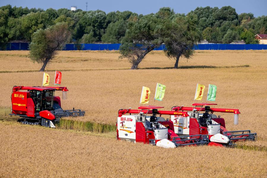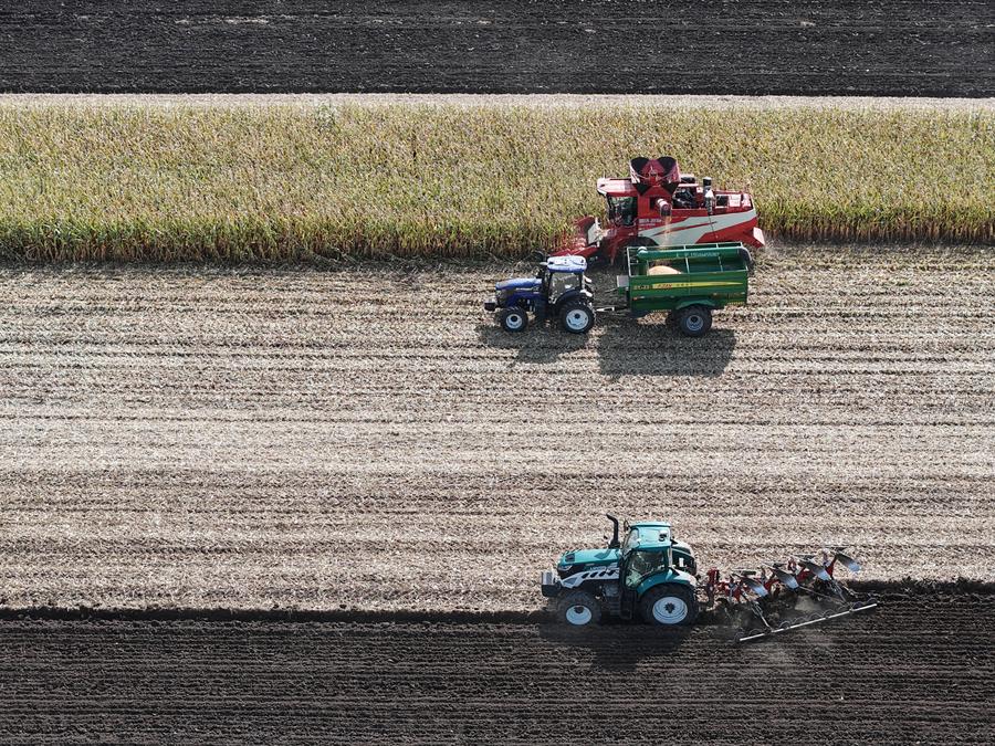 HARBIN, Sept. 25 (Xinhua) -- Drones capture agricultural machinery harvesting crops in the fields in northeast China's Heilongjiang Province, as the China's "grain barn" has entered the autumn harvest season.