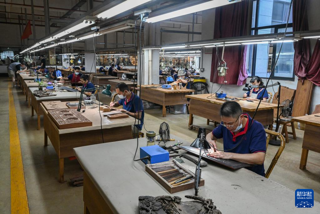 8月18日,工人在莆田仙游三福古典家具有限公司雕刻工艺美术品。