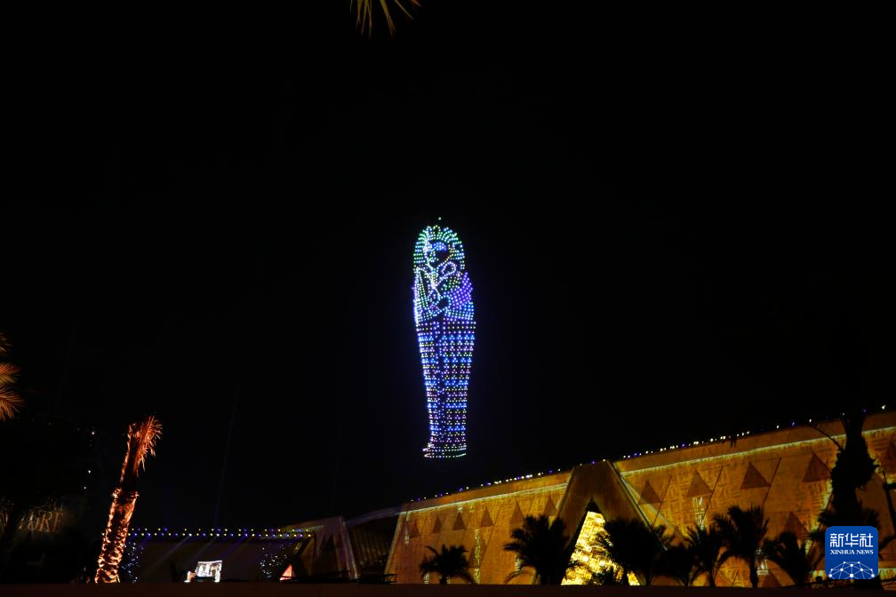 这是11月1日在埃及吉萨拍摄的开馆仪式上的无人机表演和灯光秀。