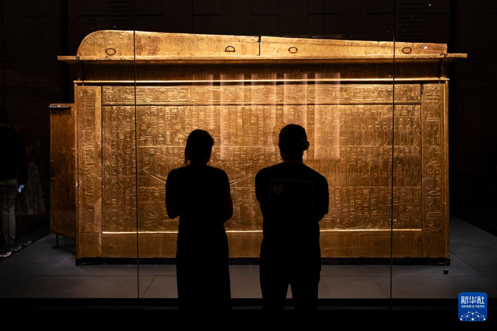 12月20日,游客在埃及吉萨的大埃及博物馆观赏法老图坦卡蒙的黄金内棺。
