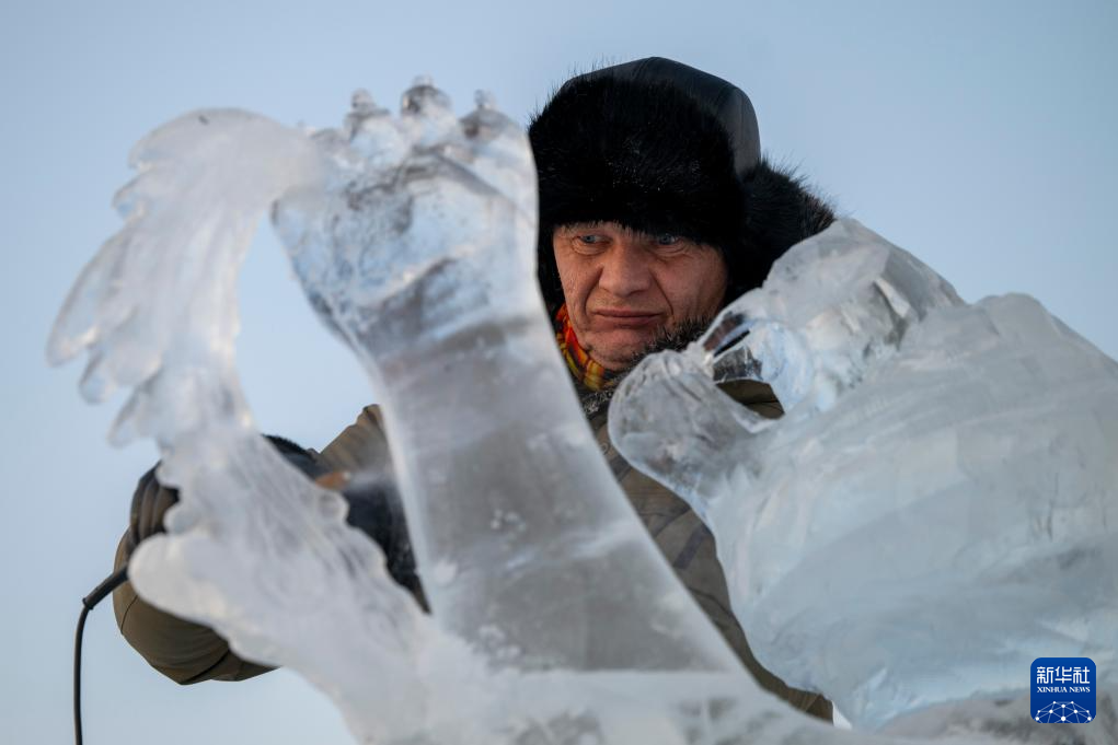 1月3日,参赛选手在哈尔滨冰雪大世界园区内进行冰雕创作。