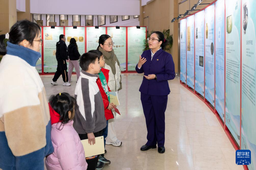1月17日,上海博物馆讲解员为参观者讲解马桥遗址出土文物。