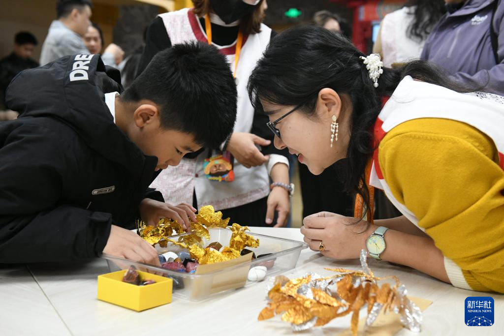 1月24日,广东省博物馆志愿者在现场指导一名小观众通过触摸模型了解文物特点。