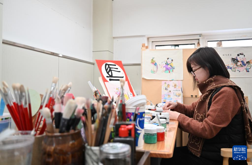 2月4日,在天津杨柳青画社,天津杨柳青画社第四代彩绘传承人王艳绘制马年年画底稿。